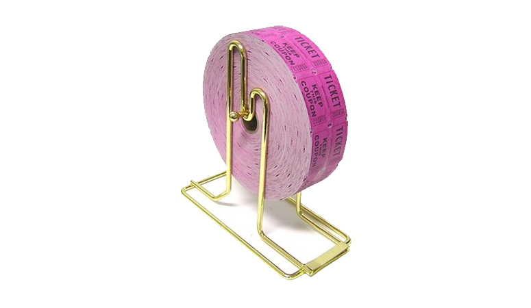 Dispense raffle tickets with ease with the Brass Plated Raffle Dispenser. Made for double- or single-roll tickets.