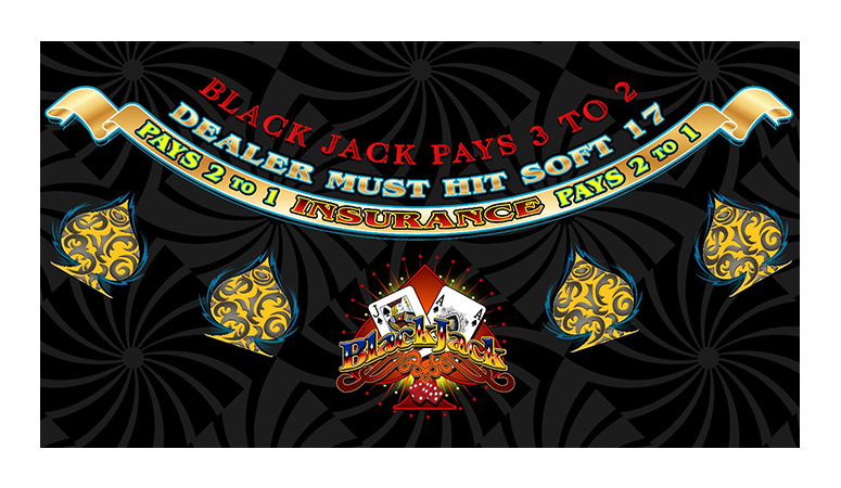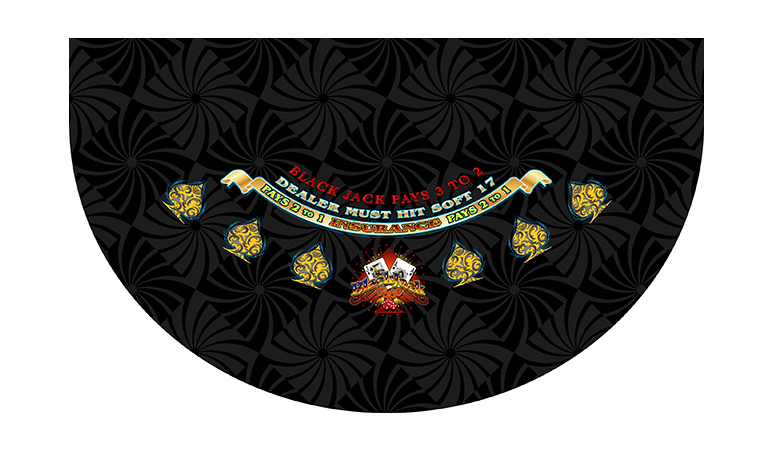 Blackjack Table Layout #1 (Suited Felt) is a casino quality layout made from a polyester blend, and is created using a dye sublimation process. Blackjack Table Layout #1 is water resistant and fire retardant, and can be altered to suit your exact needs. This product has a production time of 1 to 2 weeks before delivery.
