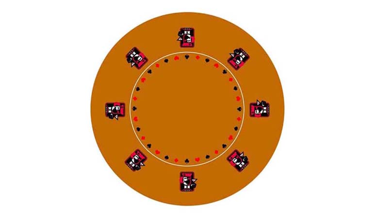 Round Poker Table Layout #10 is a casino quality layout made from a polyester blend, and is created using a dye sublimation process. Round Poker Table Layout #10 is water resistant and fire retardant, and can be altered to suit your exact needs. This product has a production time of 1 to 2 weeks before delivery.