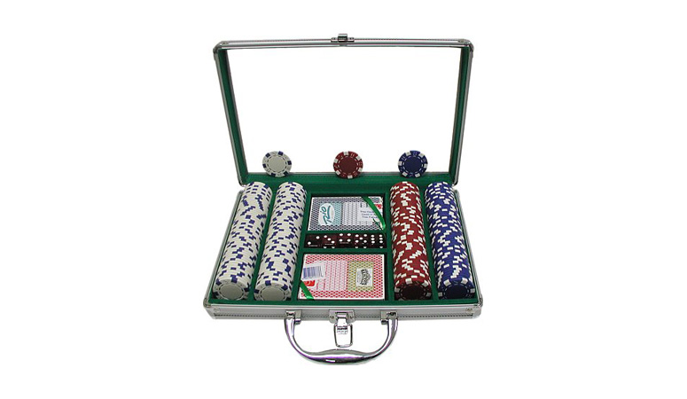 - Holds 200 poker chips, two decks of cards and 5 dice
