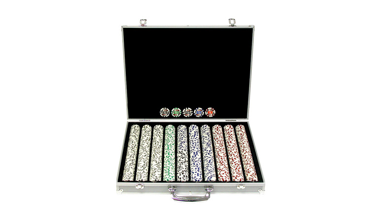 Enjoy the durability of the 300 Chip 11.5g 4 Aces Aluminum Poker Chip Set. These chips are made from a composite resin and feature a 4 Aces design. The set is enclosed in an aluminum case, made from heavy-duty materials.