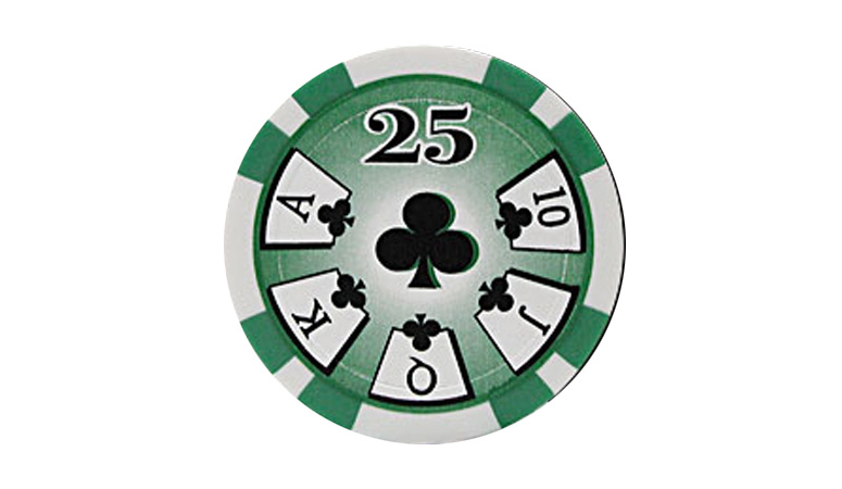 The 25 High Roller Poker Chip has several unique characteristics that separates it from the standard Poker Chip. This 39 mm diameter casino sized chip is 11.5 grams in weight. It is produced from a composite resin and an insert that gives the weight and feel of a heavy casino-quality chip. A high-quality graphic is embedded into the chip. This graphic is not a sticker and will never peel or show any kind of lift from the chip. The 1 High Roller Poker Chip has an image of a 4-of-a-kind poker hand in aces surrounding the denomination.