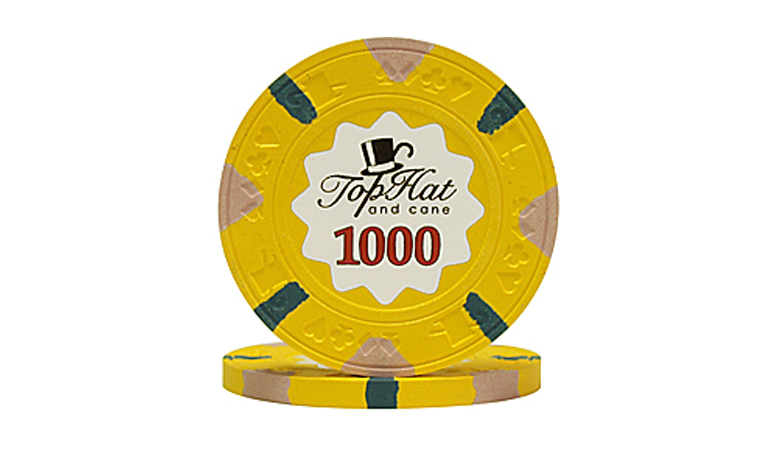 Casino quality is guaranteed with the $1,000 World Tophat & Cane Poker Chip by Paulson. The full-clay chip has a linen finish to make it easily washable. Each chip is color coded, and the inlay is sealed in the chip to prevent peeling.