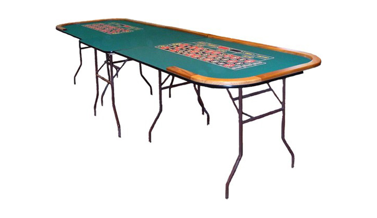 The Double Folding Roulette Table comes with a quality cloth layout, metal folding legs for easy setup and storage, black edging around the table and a removable mahogany armrest. A roulette wheel is not included, but can be purchased separately.